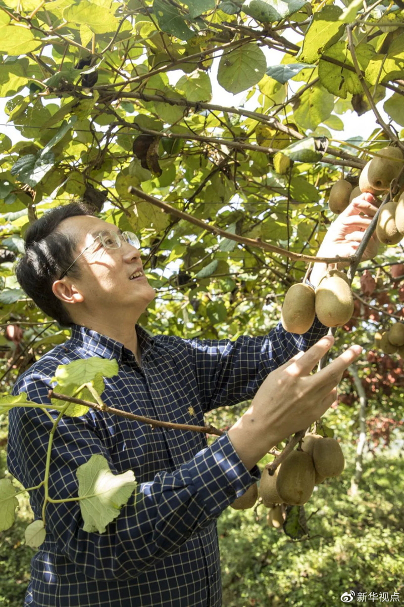 2018年,十八洞村第二任扶貧工作隊(duì)長(zhǎng)石登高在十八洞村的獼猴桃產(chǎn)業(yè)基地查看獼猴桃長(zhǎng)勢(shì) 新華社發(fā)
