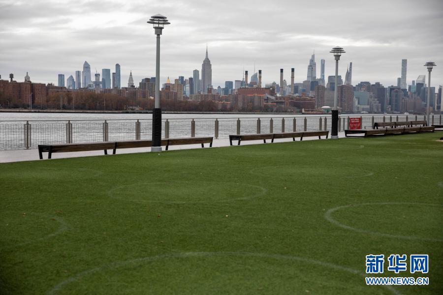 11月12日,在美國(guó)紐約多米諾公園,草坪上保持社交距離的圓圈清晰可見(jiàn)。新華社發(fā)(郭克攝)