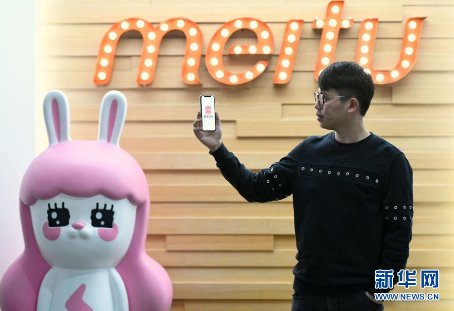 11月10日,美圖公司創(chuàng)始人兼CEO吳欣鴻展示“美圖秀秀”軟件。新華社記者 金良快 攝