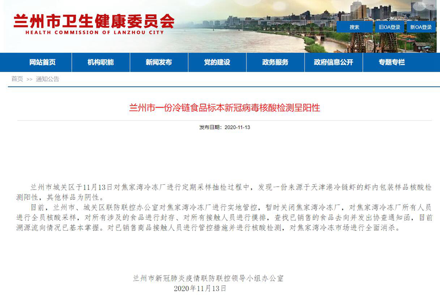 蘭州市城關(guān)區(qū)于11月13日對(duì)焦家灣冷凍廠進(jìn)行定期采樣抽檢過(guò)程中,發(fā)現(xiàn)一份來(lái)源于天津港冷鏈蝦的蝦內(nèi)包裝樣品核酸檢測(cè)陽(yáng)性,其他樣品為陰性。
