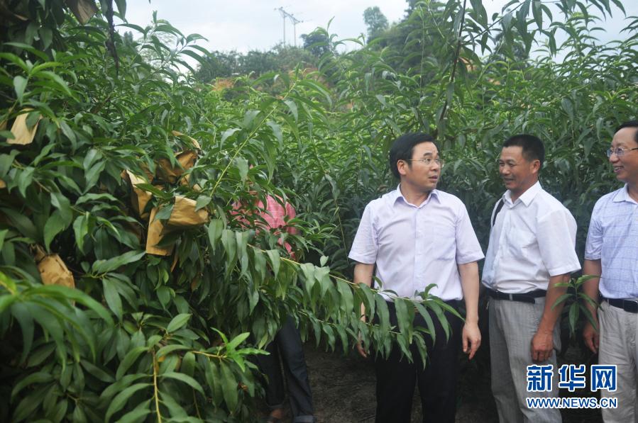 2011年7月,黃詩(shī)燕(右三)在霞陽(yáng)鎮(zhèn)考察黃桃種植業(yè)。新華社發(fā)