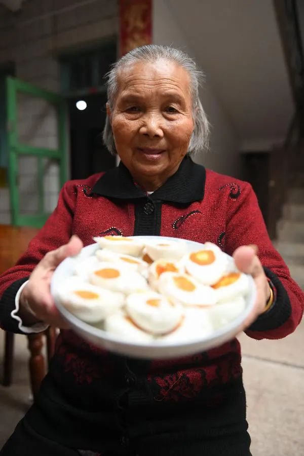 全國(guó)脫貧攻堅(jiān)獎(jiǎng)奮進(jìn)獎(jiǎng)獲得者廖秀英老奶奶在贛州瑞金市葉坪鄉(xiāng)鳳崗村家中向游客展示咸鴨蛋 劉青 攝