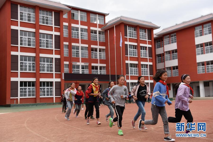 四川省布拖縣阿布澤魯小學(xué)的學(xué)生們?cè)谛虏賵?chǎng)上跑步(6月22日攝)。新華社記者 胥冰潔 攝