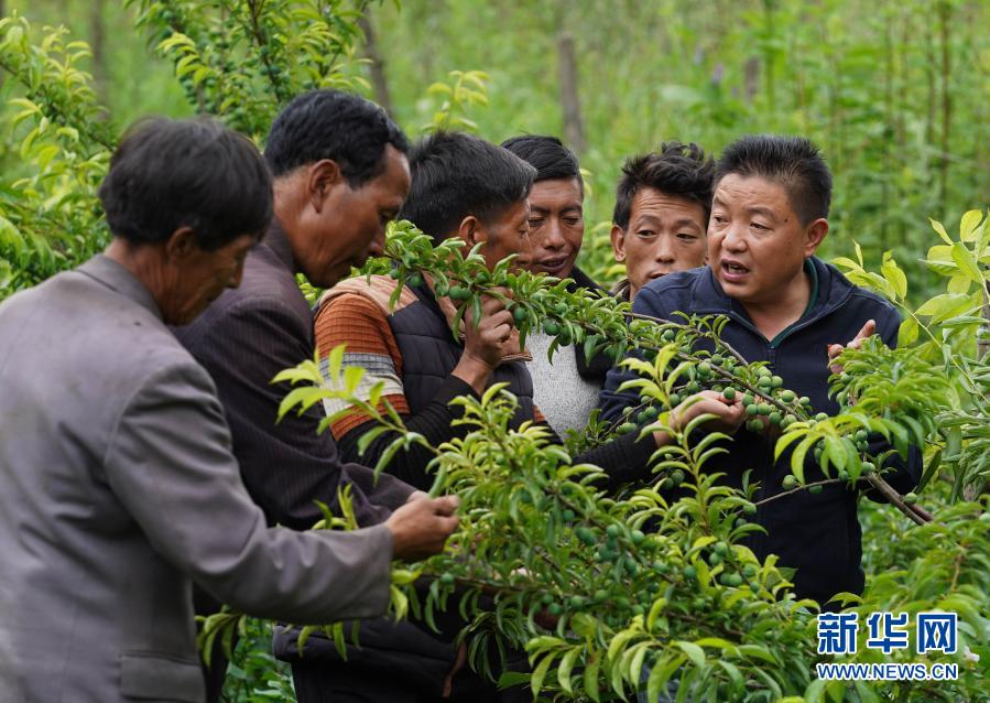 派駐到布拖縣覺撒鄉(xiāng)的幫扶干部楊永林(右一)在博作村帶領(lǐng)村民查看茵紅李掛果情況(6月22日攝)。新華社記者 江宏景 攝