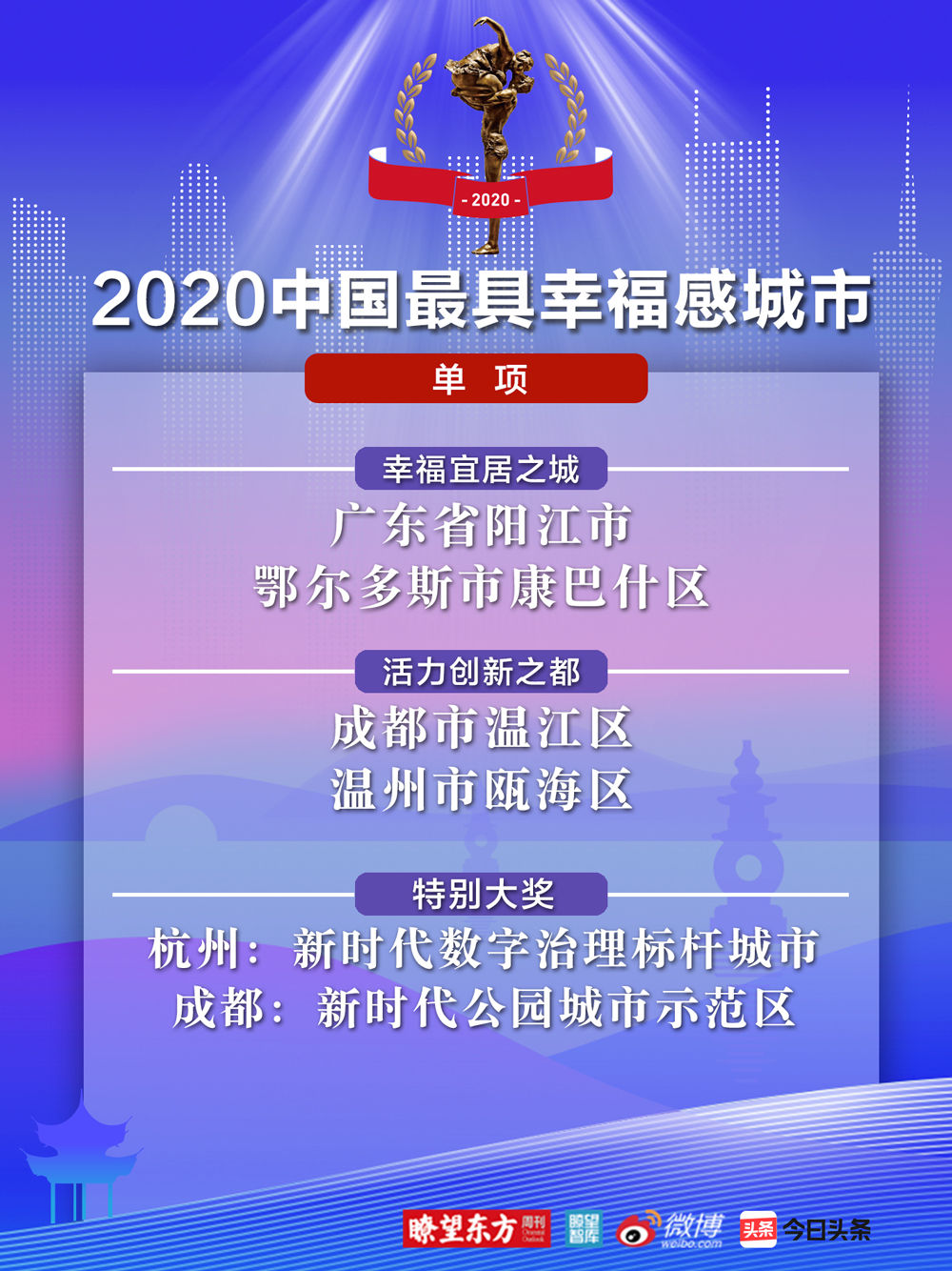 鑒于成都和杭州在城市治理方面的突出成就,組委會特別授予成都“新時代公園城市示范區(qū)”稱號、杭州 “新時代數(shù)字治理標(biāo)桿城市”稱號。另外,根據(jù)材料申報和大數(shù)據(jù)單項調(diào)查,廣東省陽江市、鄂爾多斯市康巴什區(qū)被評為“幸福宜居之城”,成都市溫江區(qū)、溫州市甌海區(qū)被評為“活力創(chuàng)新之都”。