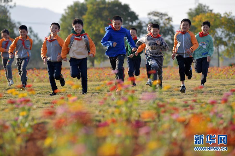 在江西省宜春市袁州區(qū)寨下中心小學(xué),學(xué)生們在花田邊玩耍(11月9日攝)。新華社記者 彭昭之 攝