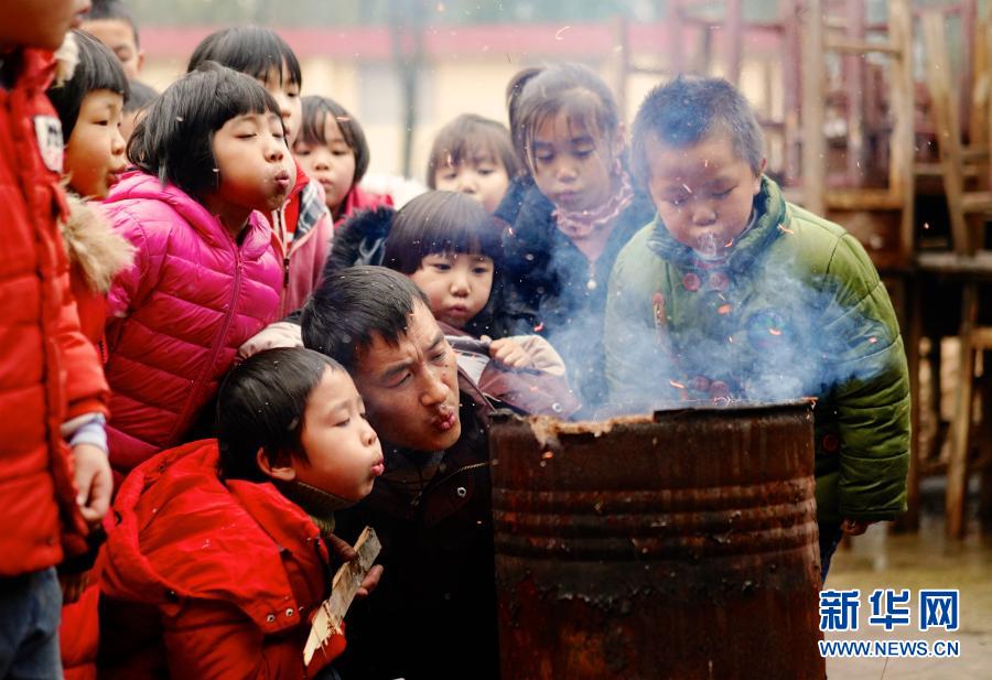 在江西省鷹潭市余江區(qū)春濤鎮(zhèn)黃泥村黃泥小學(xué),老師章站亮(前右)和學(xué)生們一起生火(2019年1月3日攝)。由于生火用的材料均是廢棄的桌椅或者枯葉,點火后得不停用嘴吹氣才能燒得旺盛。新華社記者 胡晨歡 攝