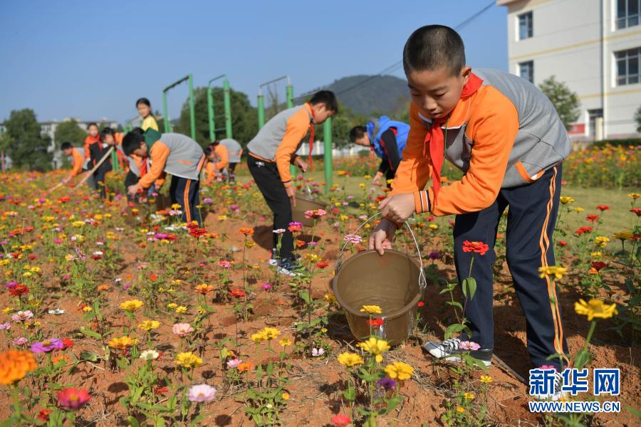 江西省宜春市袁州區(qū)寨下中心小學(xué)學(xué)生在花田勞動(11月9日攝)。新華社記者 彭昭之 攝