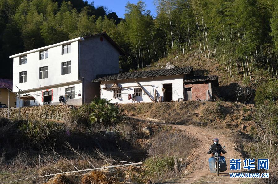 在江西省萬載縣高村鎮(zhèn)新竹村,新竹小學(xué)的校長羅長石為學(xué)生郭仕錢送完課程之后繼續(xù)趕路,去下一家送課(2月17日攝)。新華社記者 彭昭之 攝