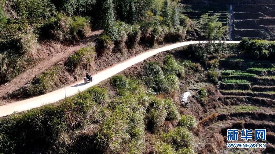 在江西省萬載縣高村鎮(zhèn)新竹村,新竹小學(xué)的校長羅長石騎行在山路上(2月17日攝,無人機(jī)照片)。他要去最偏遠(yuǎn)的村組,給學(xué)生送當(dāng)天的線上教學(xué)課程。新華社記者 彭昭之 攝