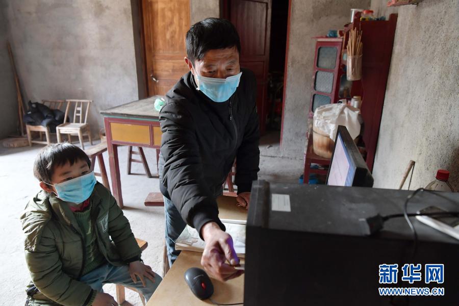 在江西省萬載縣高村鎮(zhèn)新竹村尹家?guī)X村組,新竹小學(xué)的校長羅長石在學(xué)生郭仕錢家中,為他拷貝當(dāng)天的課程(2月17日攝)。新華社記者 彭昭之 攝