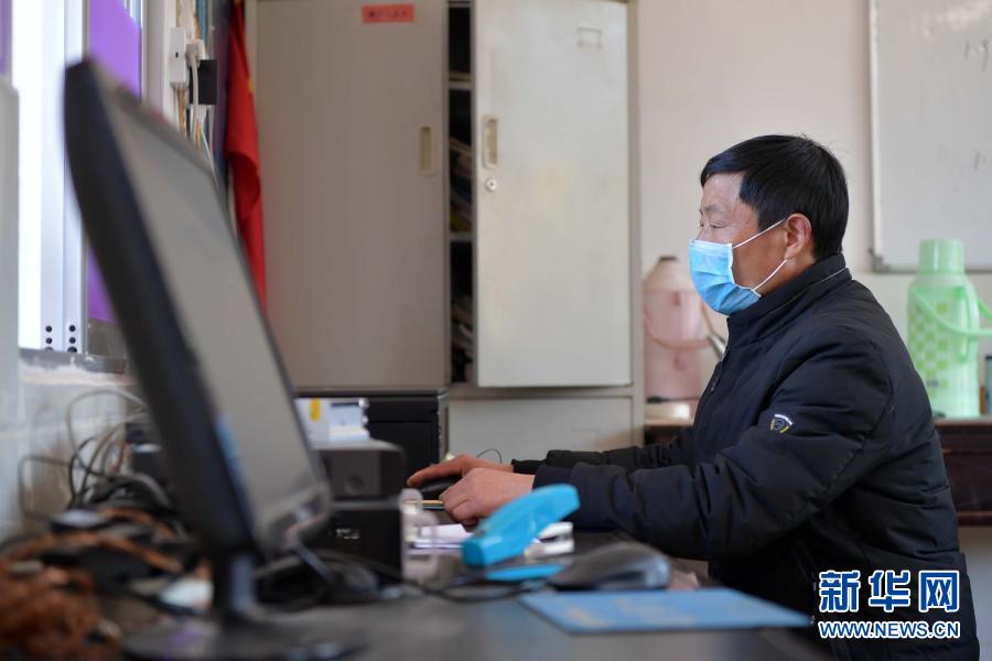 在江西省萬載縣高村鎮(zhèn)新竹村新竹小學(xué),校長羅長石邊播邊錄當(dāng)天的線上教育課程(2月17日攝)。新華社記者 彭昭之 攝