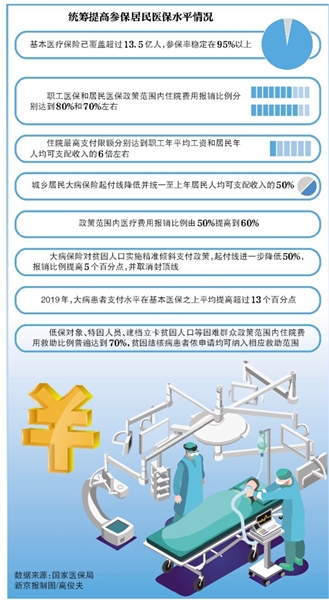 城鄉(xiāng)居民大病保險起付線降低并統(tǒng)一至上年居民人均可支配收入的50%,政策范圍內(nèi)醫(yī)療費用報銷比例由50%提高到60%。同時,大病保險對貧困人口實施精準(zhǔn)傾斜支付政策,起付線進一步降低50%,報銷比例提高5個百分點,并取消封頂線。2019年,大病患者支付水平在基本醫(yī)保之上平均提高超過13個百分點。