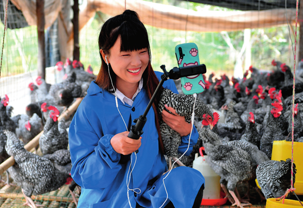 陜西省商洛市丹鳳縣寺坪鎮(zhèn)寺坪村村民李萌在自家雞棚里網(wǎng)絡(luò)直播賣貨(9月10日攝) 劉瀟攝