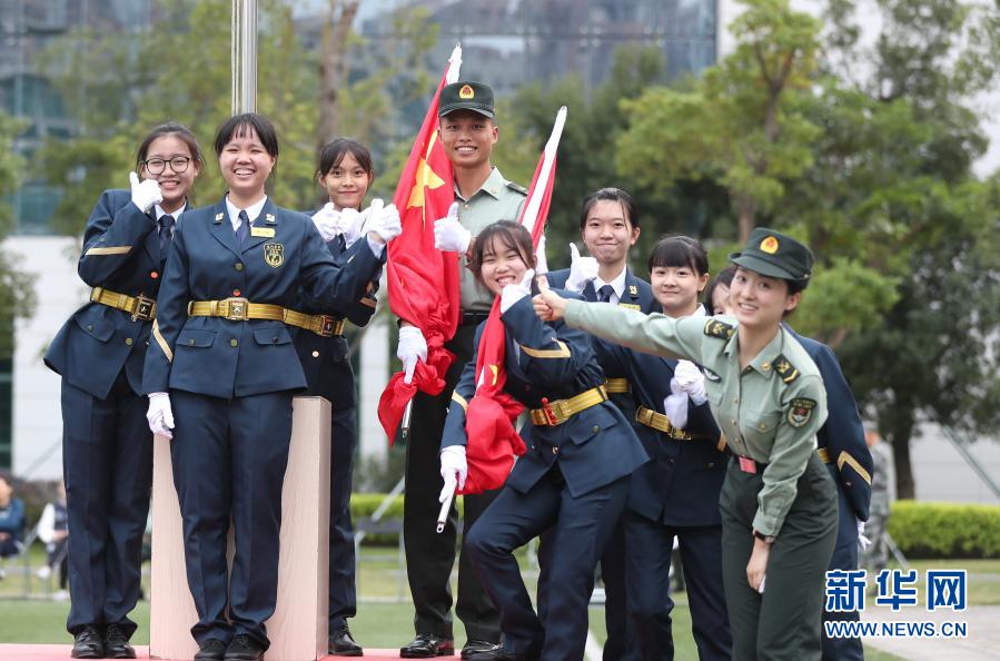 澳門學(xué)生和駐軍戰(zhàn)士合影(11月21日攝)。新華社發(fā)(方釗攝)