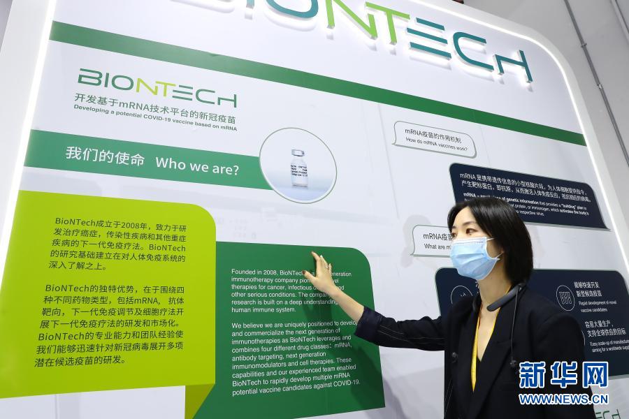 11月5日,在第三屆中國國際進(jìn)口博覽會(huì)上,工作人員在醫(yī)療器械及醫(yī)藥健康展區(qū)介紹由復(fù)星醫(yī)藥與德國拜恩泰科合作開發(fā)的新冠病毒mRNA(信使核糖核酸)疫苗。新華社記者 張玉薇 攝