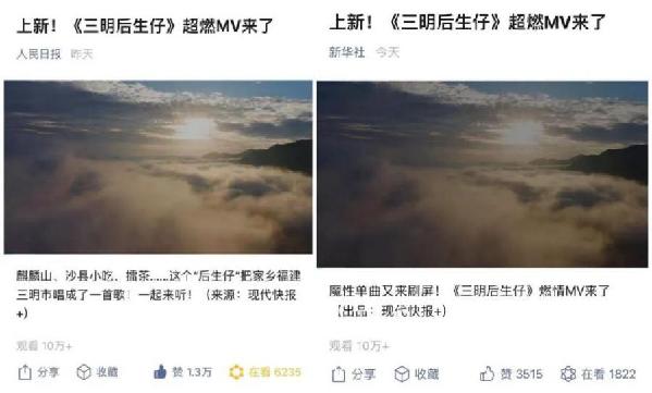 《三明后生仔》MV上線后,被人民日報、新華社、央視新聞、光明日報等多家媒體轉載,其中,人民日報、新華社微信公號均單篇推送,閱讀量很快超10萬+。在新浪微博、抖音、B站等多個平臺圈粉無數(shù),還被福建日報、東南衛(wèi)視、福州日報等多家當?shù)孛襟w積極轉發(fā)。其中,學習強國平臺在首頁“這里是三明”板塊重點推薦。新浪微博話題#三明后生仔#閱讀量超4810萬,登上微博熱搜榜,數(shù)據(jù)還在持續(xù)攀升。