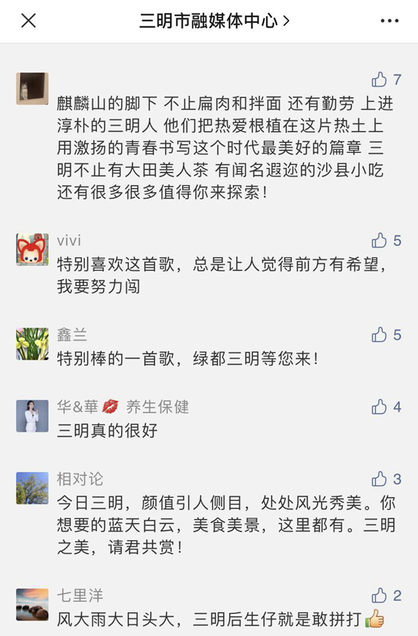 “我大福建真是處處美得沒話說!”“哈哈,我大沙縣又壓軸了。”“太好聽了!內(nèi)心充滿自豪!”“開門見綠,抬頭見藍,這就是我的家鄉(xiāng)?!边€有網(wǎng)友希望這首歌“能上春晚”。更有網(wǎng)友吟誦起三明,“好山好水好風情,數(shù)一數(shù)二數(shù)三明。紅軍長征出發(fā)地,客家文化傳世界 …… ”