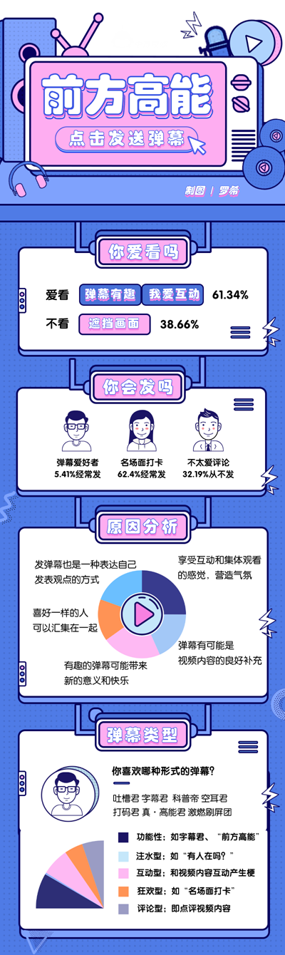 中青校媒調(diào)查顯示,受訪大學生對不同類型的“彈幕君”喜好程度不一,其中“科普帝”以59.66%位列排行榜第一,“真·高能君”占52.77%,“字幕君”占52%,之后依次是“吐槽君”“激燃刷屏團”“空耳君”“打碼君”,分別占42.7%、19.06%、12.13%和7.86%。