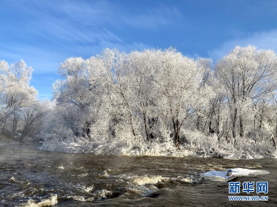 遜克縣位于黑龍江省北部,冬季漫長而寒冷。當(dāng)?shù)貛鞝枮I水電站放水時,水遇冷形成霧氣,落到樹枝上凝結(jié)成霜花,在平臺村周邊形成綿延的霧凇景觀。