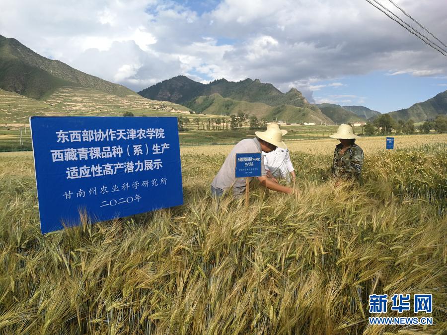 天津農(nóng)學(xué)院種子科學(xué)與工程系主任趙飛(左)在甘肅省甘南州建成的青稞增產(chǎn)技術(shù)集成示范基地工作(8月5日攝)。新華社發(fā)