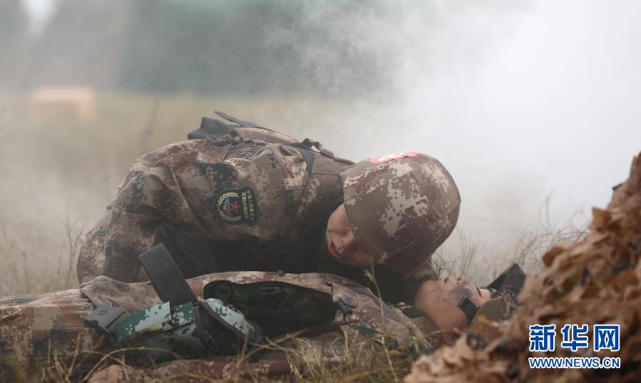 衛(wèi)勤專業(yè)參賽隊(duì)員在進(jìn)行戰(zhàn)場(chǎng)“傷員”急救(11月29日攝)。新華社發(fā)(武一明 攝)
