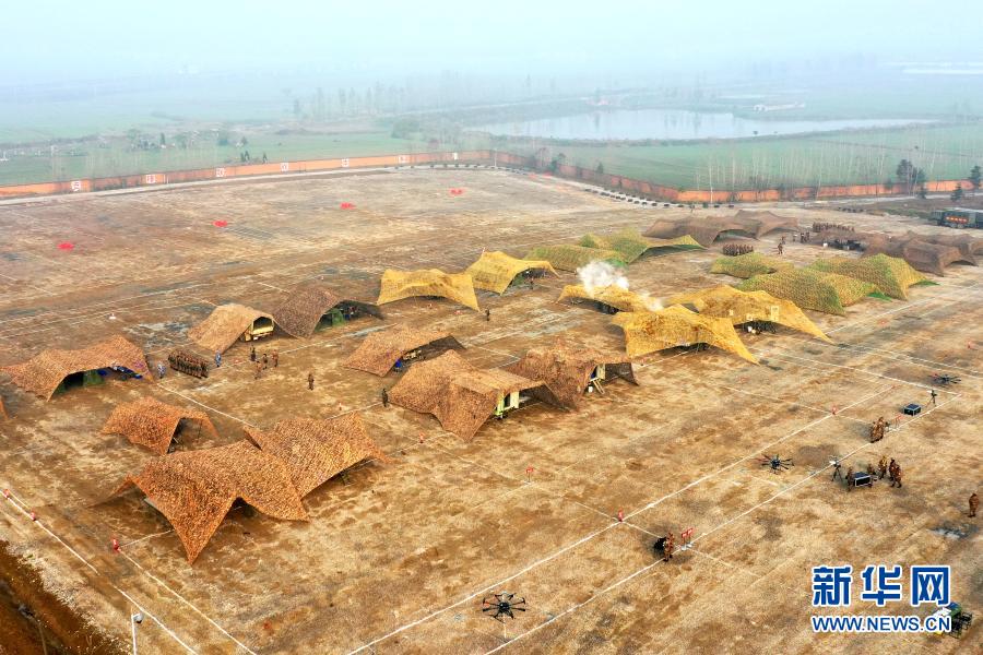 飲食保障隊(duì)參賽隊(duì)員在偽裝網(wǎng)下的炊事車內(nèi)加工野戰(zhàn)快餐,并利用無人機(jī)前送(11月29日攝,無人機(jī)照片)。新華社發(fā)(姜梓涵 攝)