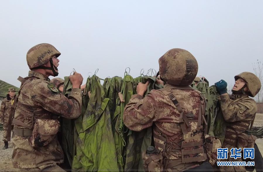 宿營保障隊(duì)參賽隊(duì)員在搭設(shè)野戰(zhàn)宿營帳篷(11月30日視頻截圖)。新華社發(fā)(呂冀周 攝)