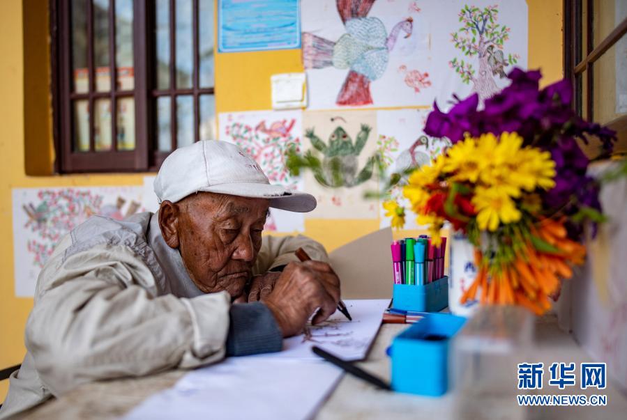 彝族老農(nóng)羅家政坐在家門口畫畫(11月30日攝)。新華社記者 江文耀 攝