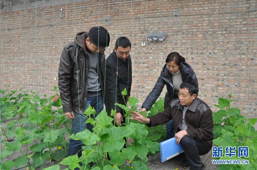 李加旺(右一)與課題組成員一起觀察黃瓜植株的生長情況(2014年11月27日攝)。新華社發(fā)(天津科潤黃瓜研究所供圖)