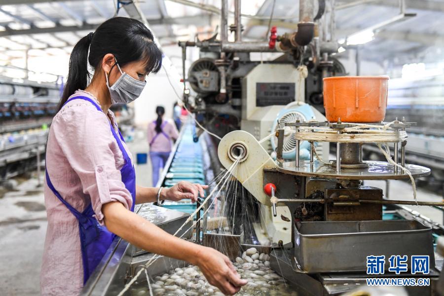 工人在廣西凌云縣一家繅絲廠內(nèi)煮繭抽絲(4月17日攝)。新華社記者 曹祎銘 攝