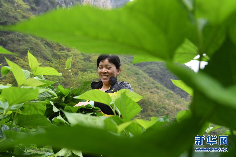 在廣西百色市凌云縣下甲鎮(zhèn)加西村,當(dāng)?shù)卮迕裨诓烧H~(2019年3月27日攝)。新華社記者 陸波岸 攝