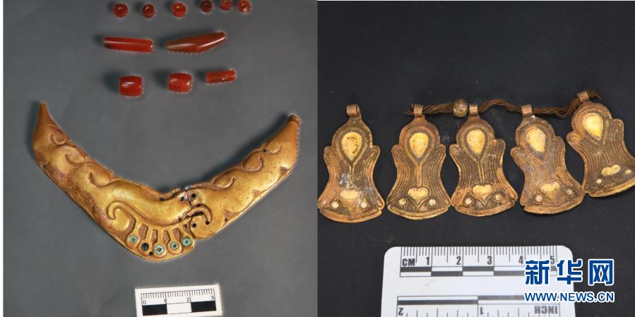 桑達(dá)隆果墓地出土的金項飾、瑪瑙等(資料照片)。新華社發(fā)