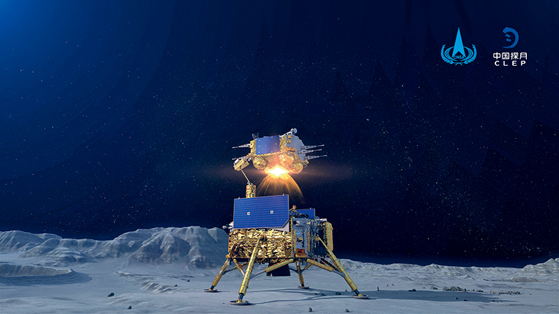 12月3日23時(shí)10分,嫦娥五號上升器月面點(diǎn)火,3000 牛發(fā)動機(jī)工作約6 分鐘后,順利將攜帶月壤的上升器送入到預(yù)定環(huán)月軌道,成功實(shí)現(xiàn)我國首次地外天體起飛。這是嫦娥五號上升器月面點(diǎn)火瞬間模擬 圖國家航天局供圖