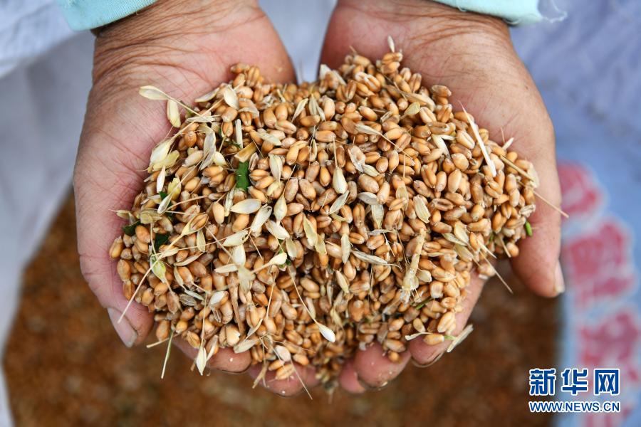 農(nóng)民在貴州省思南縣邵家橋鎮(zhèn)烏石村展示收獲的小麥(5月13日攝)。