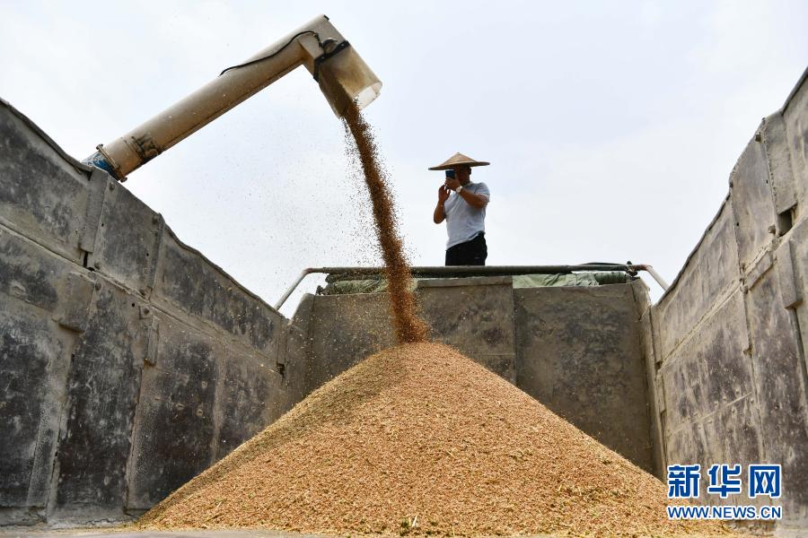 在貴州省思南縣塘頭鎮(zhèn)芭蕉壩區(qū),農(nóng)民用卡車在裝載新收獲的小麥(5月13日攝)。
