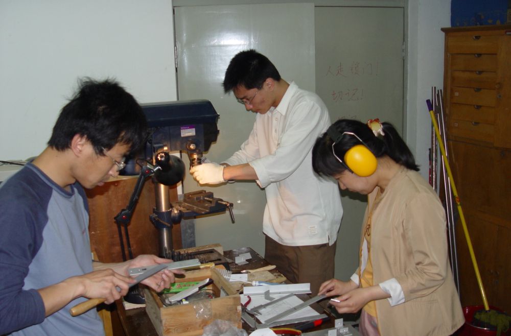 ↑甘恒謙(左一)和同事一起在做接收機(jī)的盒子(由受訪者提供)