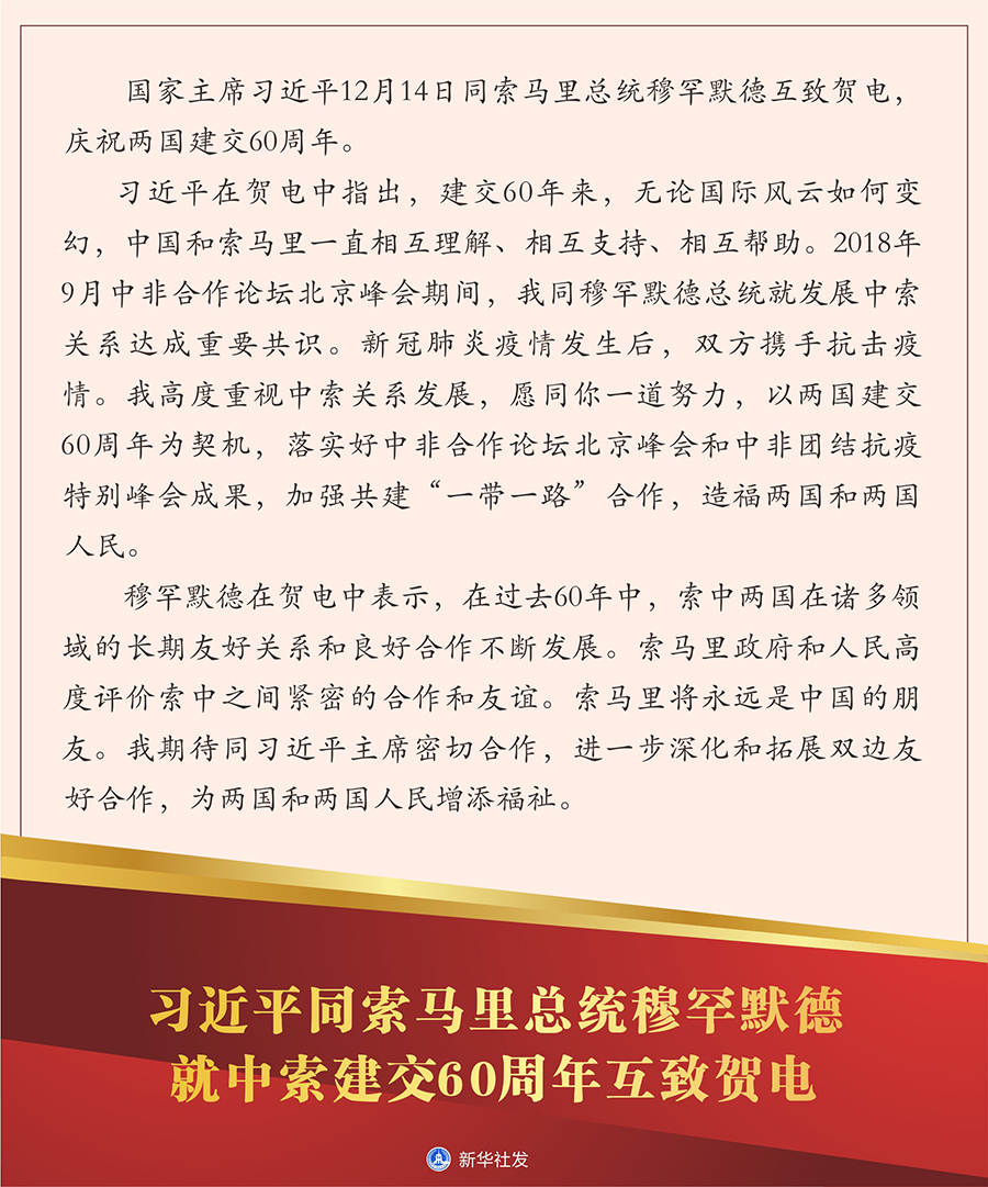 習(xí)近平在賀電中指出,建交60年來,無論國際風(fēng)云如何變幻,中國和索馬里一直相互理解、相互支持、相互幫助。2018年9月中非合作論壇北京峰會期間,我同穆罕默德總統(tǒng)就發(fā)展中索關(guān)系達成重要共識。新冠肺炎疫情發(fā)生后,雙方攜手抗擊疫情。我高度重視中索關(guān)系發(fā)展,愿同你一道努力,以兩國建交60周年為契機,落實好中非合作論壇北京峰會和中非團結(jié)抗疫特別峰會成果,加強共建“一帶一路”合作,造福兩國和兩國人民。