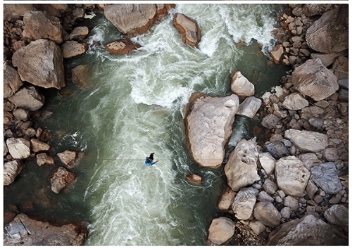 ????2018年3月12日,貴州省威寧縣海拉鎮(zhèn)花果村的村民利用尚未拆除的溜索過江。楊文斌 攝