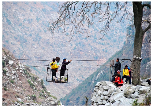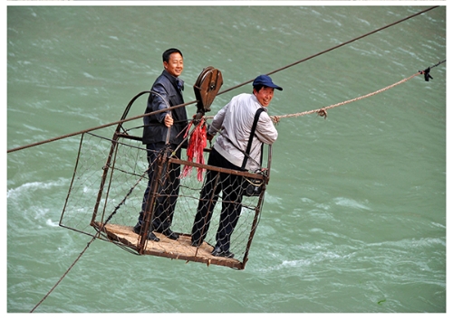 ????2013年3月7日,云南省會(huì)澤縣火紅鄉(xiāng)的村民乘坐溜索到貴州省威寧縣。楊文斌 攝