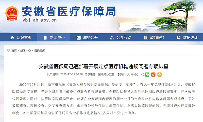 據(jù)安徽省醫(yī)保局網(wǎng)站消息,2020年12月14日,新京報(bào)報(bào)道《安徽太和多家醫(yī)院疑騙保:沒(méi)病變“腦?!?,有人一年免費(fèi)住院9次》后,安徽省醫(yī)保局高度重視,當(dāng)天立即與省衛(wèi)健委組成聯(lián)合檢查督導(dǎo)組,全程跟蹤督導(dǎo)太和縣迅速?gòu)氐撞榍暹`規(guī)事實(shí),嚴(yán)格依法依規(guī)處理。