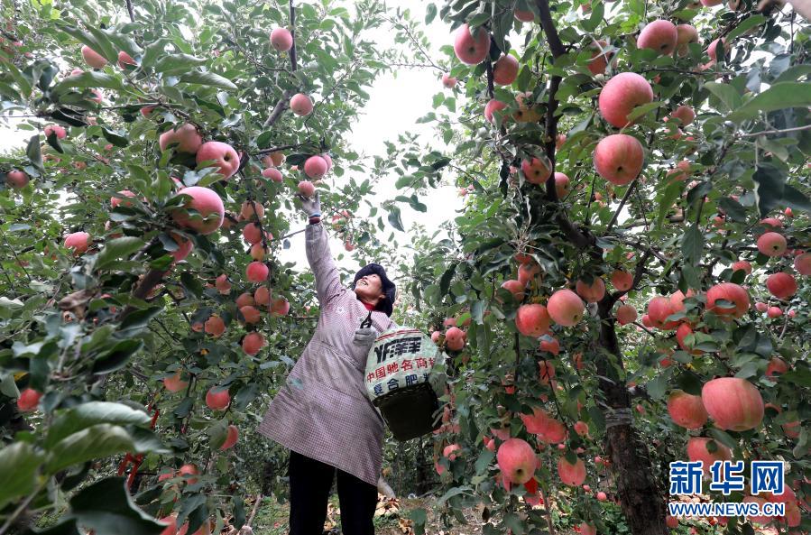 在石家莊市井陘縣孫莊鄉(xiāng)洛陽村蘋果園內(nèi),農(nóng)戶在采摘蘋果(10月20日攝)。新華社發(fā)(梁子棟 攝)