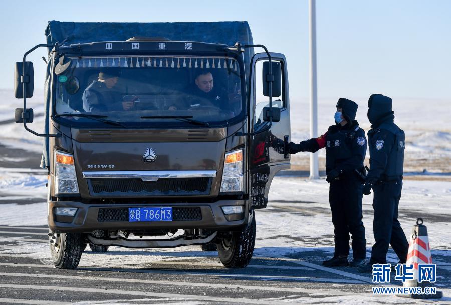 12月15日,內(nèi)蒙古烏蘭察布邊境管理支隊(duì)腦木更邊境派出所民警在主著陸場區(qū)附近檢查來往車輛。新華社記者 連振 攝