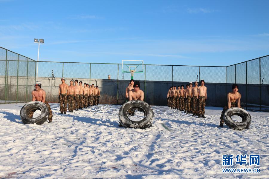 武警黑龍江總隊黑河支隊官兵冒著零下20攝氏度嚴寒在雪中開展翻輪胎訓練(12月10日攝)。新華社發(fā)(李響 攝)