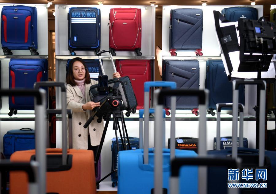 12月11日,河北保定白溝新城一家箱包生產(chǎn)企業(yè)的主播在進(jìn)行產(chǎn)品推介和銷售。新華社記者 王曉 攝