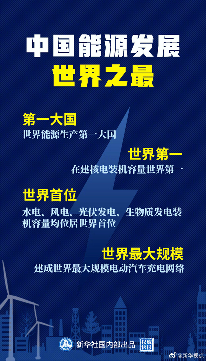 根據(jù)國務(wù)院新聞辦公室21日發(fā)布的《新時代的中國能源發(fā)展》白皮書,中國能源發(fā)展有多個世界之最:初步核算,2019年中國一次能源生產(chǎn)總量達(dá)39.7億噸標(biāo)準(zhǔn)煤,為世界能源生產(chǎn)第一大國;截至2019年底,在運(yùn)在建核電裝機(jī)容量6593萬千瓦,居世界第二,在建核電裝機(jī)容量世界第一;截至2019年底,水電、風(fēng)電、光伏發(fā)電、生物質(zhì)發(fā)電裝機(jī)容量分別達(dá)3.56億千瓦、2.1億千瓦、2.04億千瓦、2369萬千瓦,均位居世界首位;截至2019年底,全國電動汽車充電基礎(chǔ)設(shè)施達(dá)120萬處,建成世界最大規(guī)模充電網(wǎng)絡(luò)。(記者:劉羊旸 海報設(shè)計:張晨光)