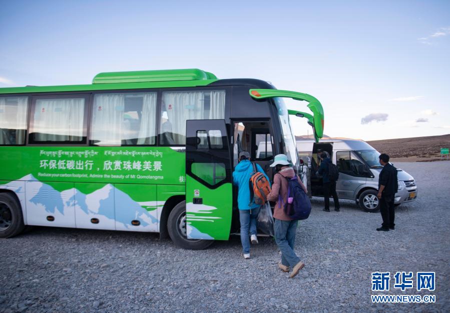 游客在珠穆朗瑪峰景區(qū)停車場轉(zhuǎn)乘環(huán)??蛙嚕?019年5月16日攝)。珠穆朗瑪峰景區(qū)內(nèi)自2019年5月開始試運營清潔能源環(huán)??蛙?,以進一步平衡珠峰地區(qū)旅游發(fā)展與環(huán)境保護需要。新華社記者 孫非 攝