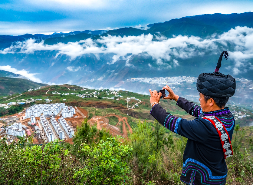 ????四川涼山彝族自治州金陽縣馬依足鎮(zhèn)“千戶彝寨”東山易地移民社區(qū),占地300余畝,2020年8月完工,已完成安置易地搬遷戶1600多戶。圖為易地搬遷居民在看望即將搬入的新居時,用手機(jī)記錄下美麗的新家園。 楊黎明 攝