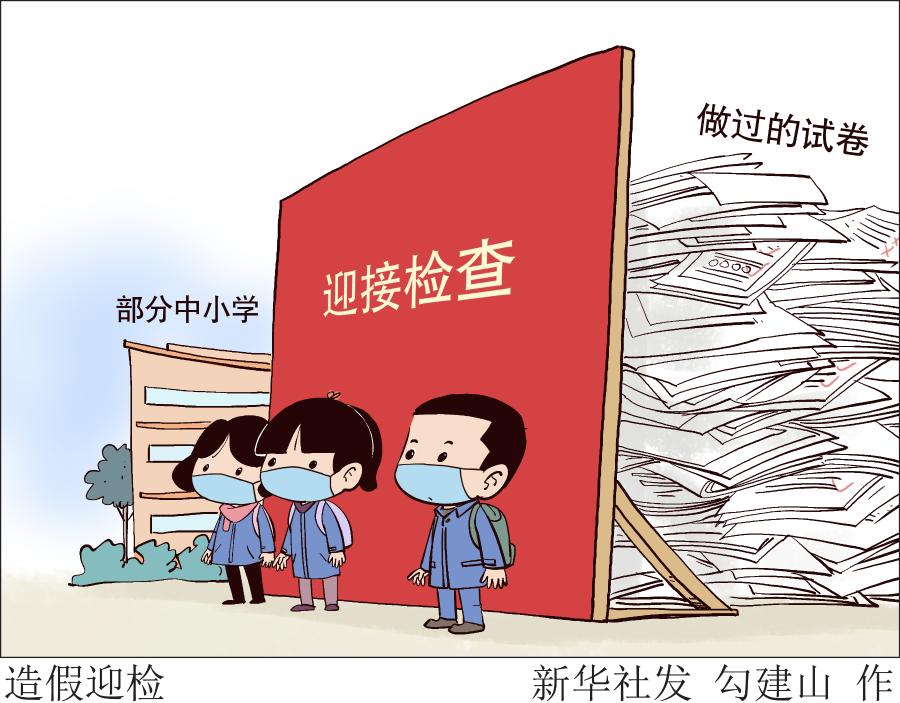 “明天學(xué)校迎接本學(xué)期檢查,所有做過的試卷都放在家里!”“檢查組要來,學(xué)校文化墻上再貼幾個(gè)標(biāo)語(yǔ)”……進(jìn)入12月后,部分中小學(xué)師生全力以赴迎檢,有的學(xué)校甚至停止正常的教育教學(xué),反復(fù)叮囑孩子“藏好試卷”,造假迎檢。