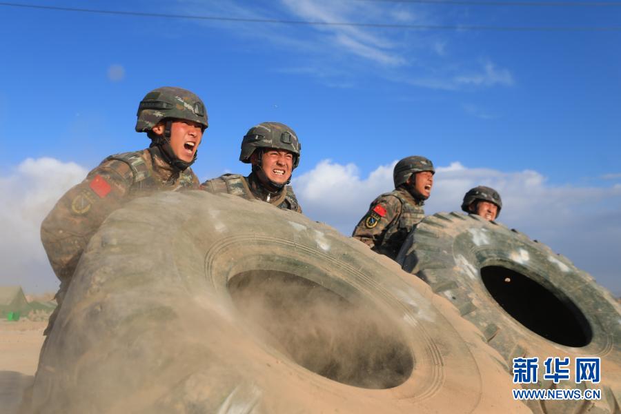 武警新疆總隊某機動支隊特戰(zhàn)一中隊組織官兵進行翻輪胎體能訓(xùn)練(10月30日攝)。新華社發(fā)(張文 攝)